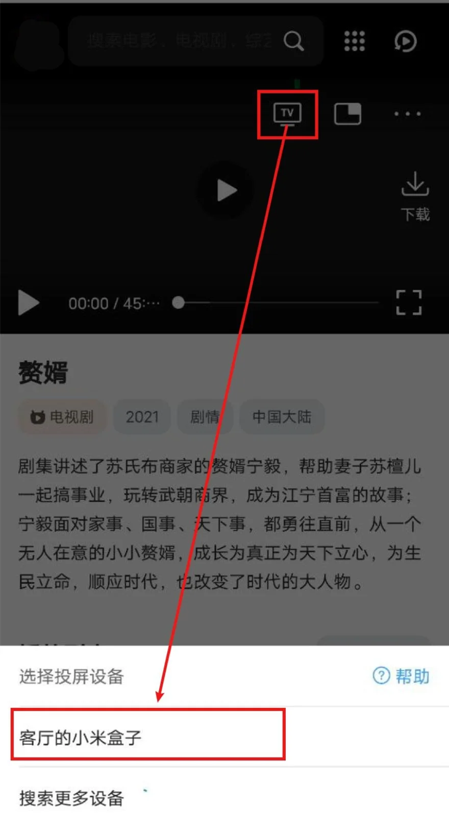打开QQ浏览器(会接管网页播放器)->打开小郑之家->播放视频->选中投屏图标->等待搜寻出智能电视/电视盒子->选中,即可投屏。